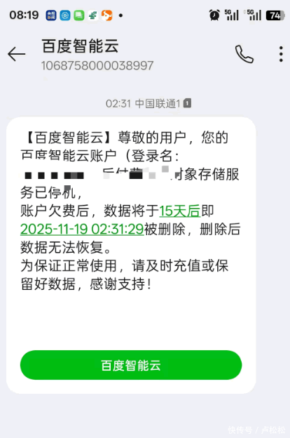 凌晨2.31分,百度智能云发来短信,提醒帐户欠费,服务已停机,数据将于15天后删除。不过小伙说,只是短信说停机了,但实际上什么服务也没停止。